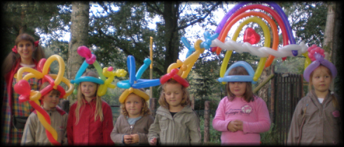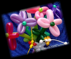 Ruck-Zuck! Aus einem langen Luftballon modelliere ich: Sommer-Blumen, fröhlichen Osterhasen, gruselige Spinnen zu Hallooween, festliche Weihnachtskraenze, Hunde, Affen, Katzen, Bienen, Maeuse, Pferde, Dinosaurier, Elefanten, Giraffen, Schmetterlinge, Marienkaefer... und vieles mehr! |